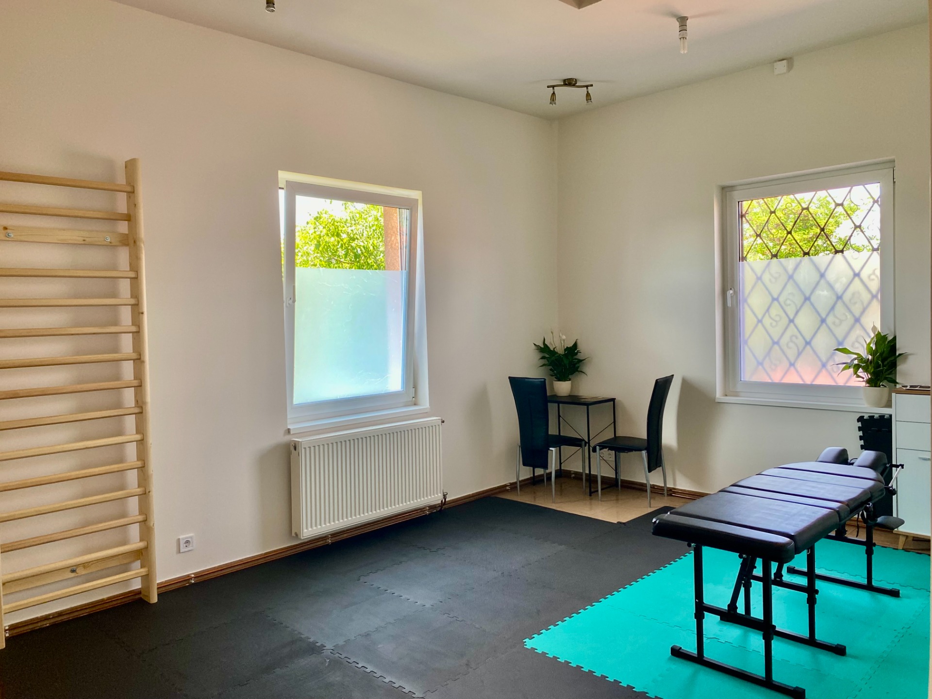 Barátságos, tatamival borított terem vár, ahol a puha burkolat biztonságos alapot nyújt a talajközeli gyakorlatokhoz és kezelésekhez. A fitball a gerinc mobilizálásában és az egyensúly fejlesztésében segít, míg a bordásfal sokoldalúan használható nyújtáshoz és erősítéshez. A masszázságy pedig kényelmes hátteret biztosít a manuálterápiás kezelésekhez.